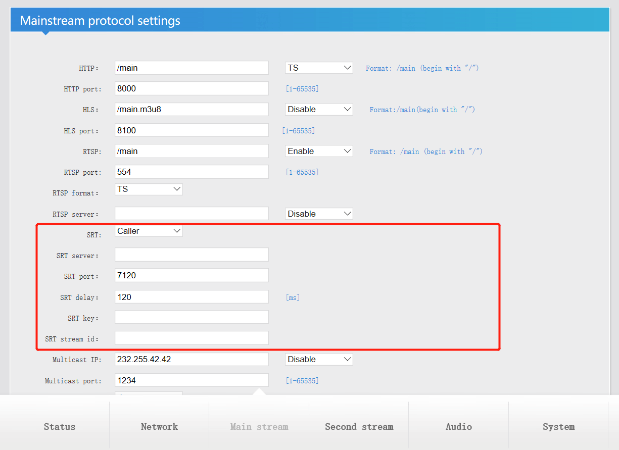 SRT Protocol configuration