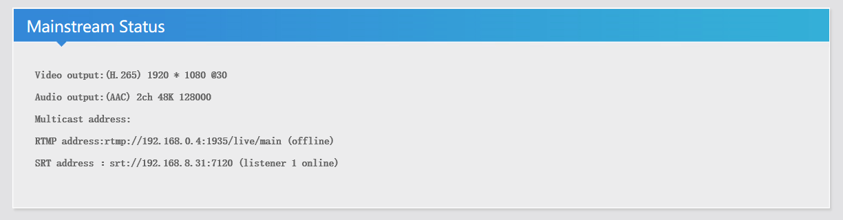 After reboot the encoder, there is a set of SRT stream address in the status page (As shown below)