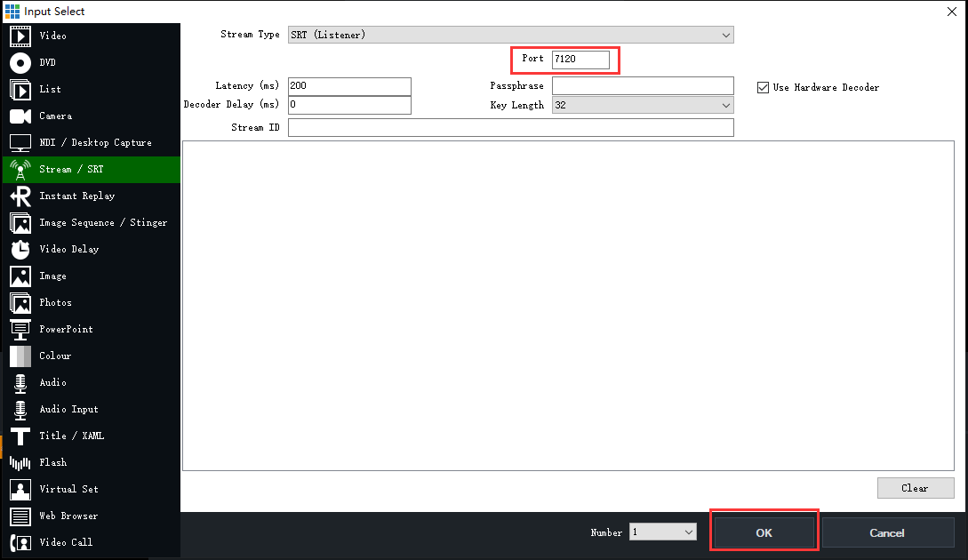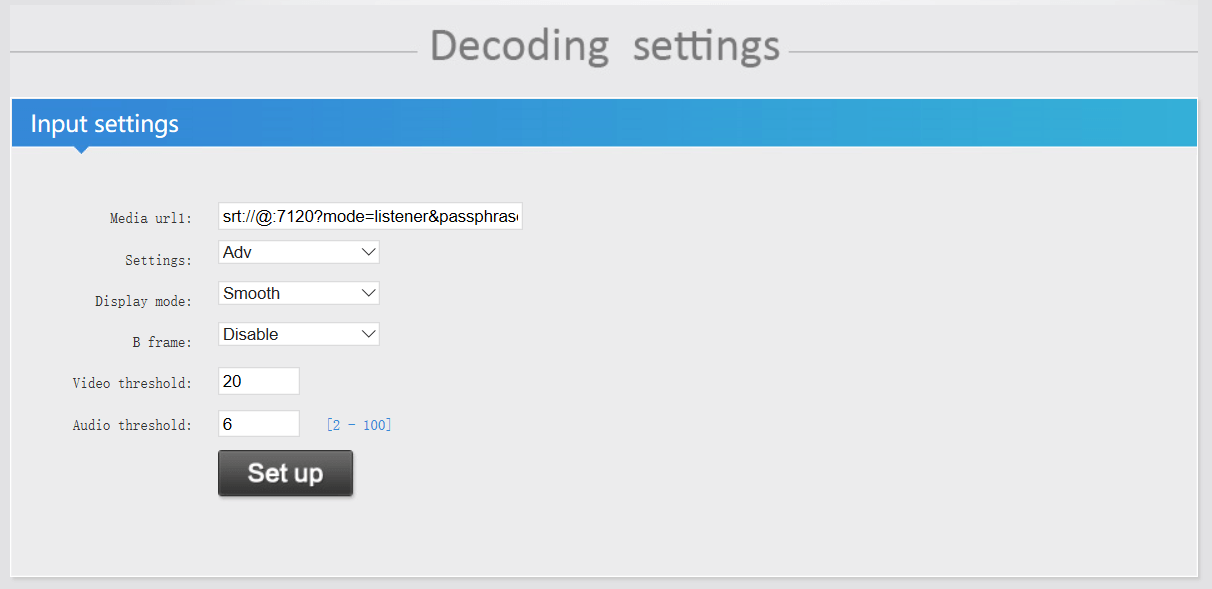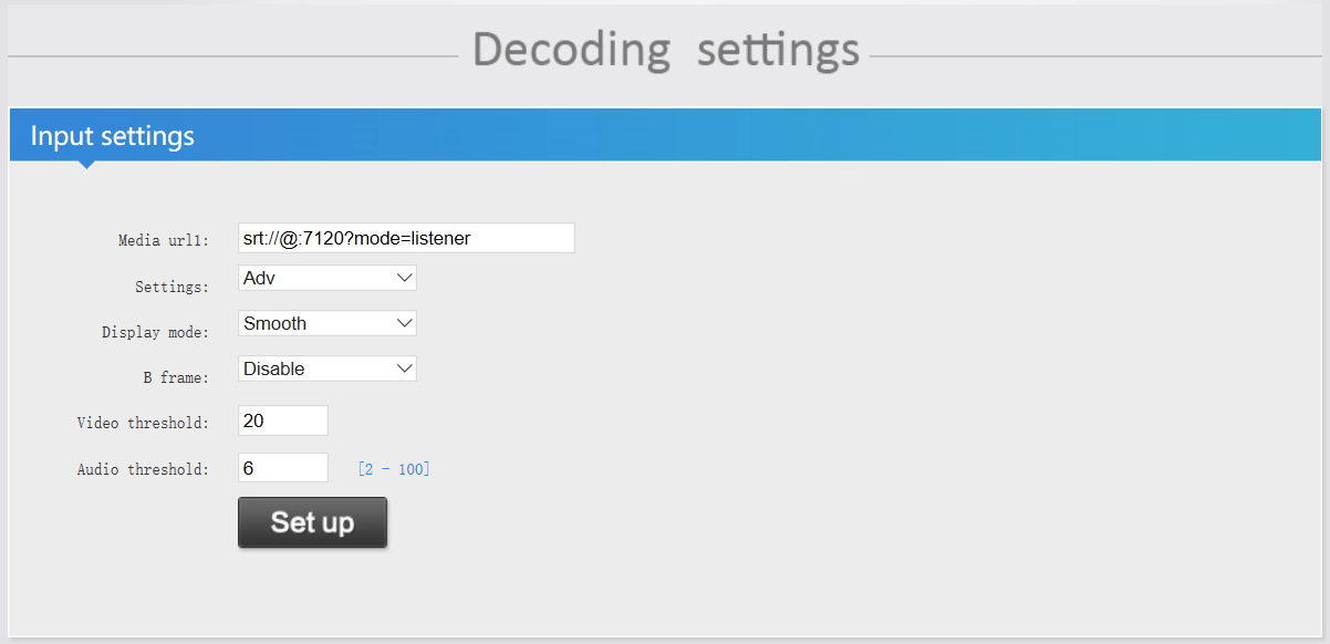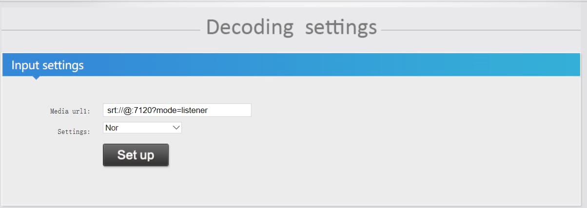 2.6 Input SRT address in the video decoder, that srt address format: srt://@:port?mode=listener