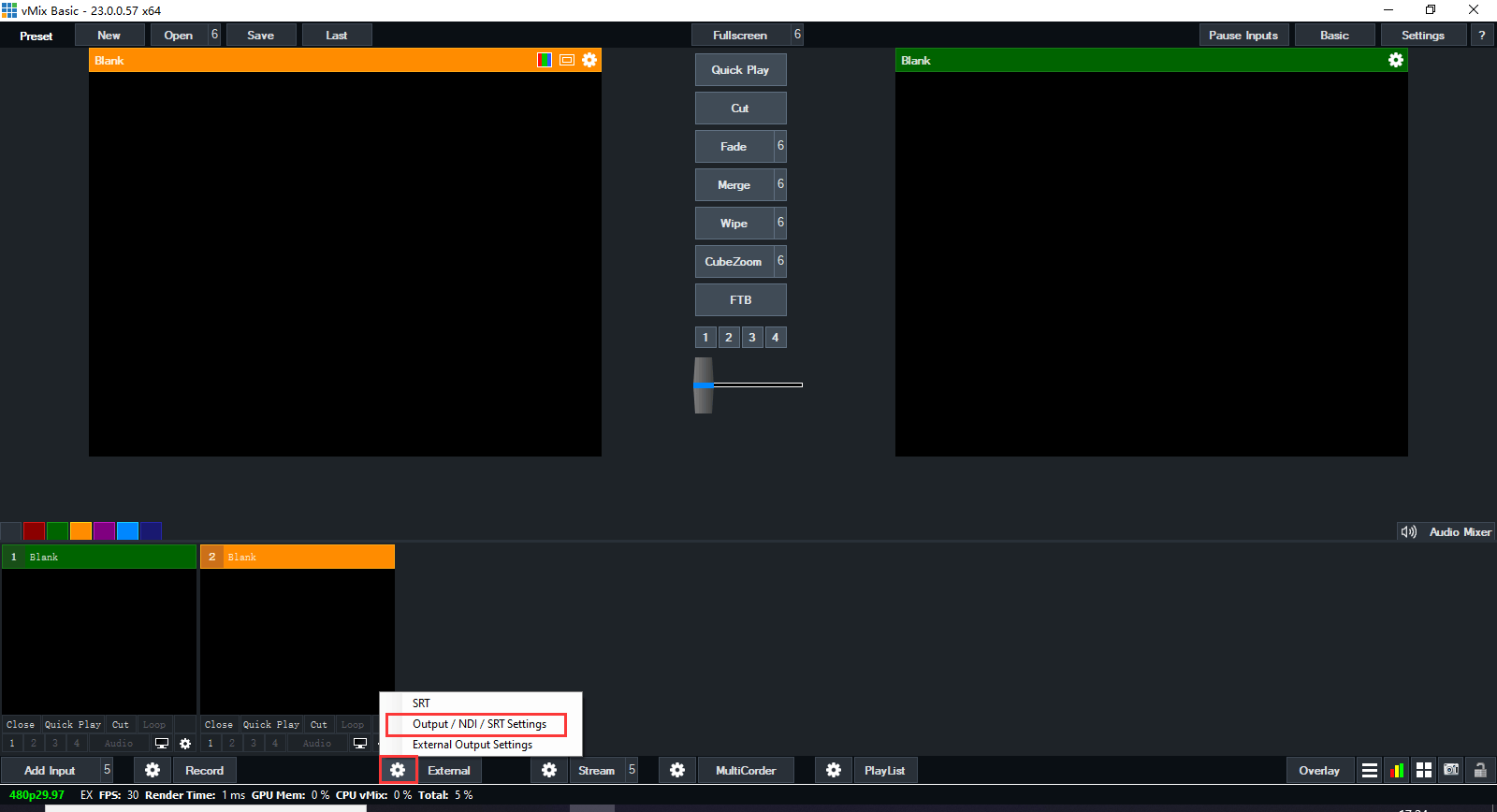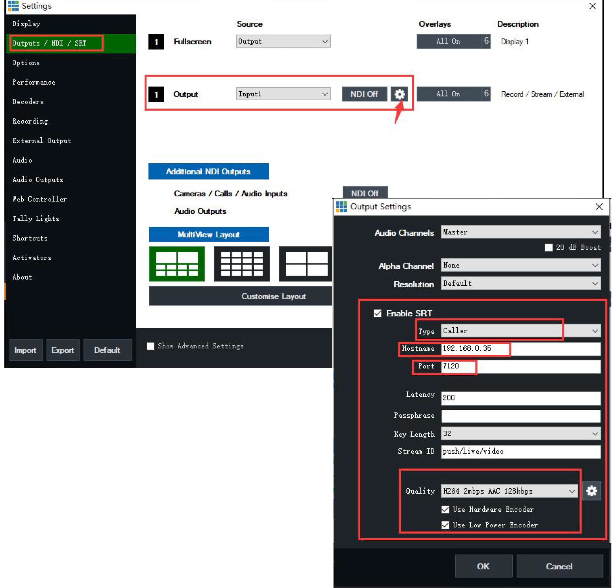 2.1Open the VMIX software, and click “” the button (As shown bellow), then choose “Output/NDI/SRT Setting”, then pop up a “Settings” Window,