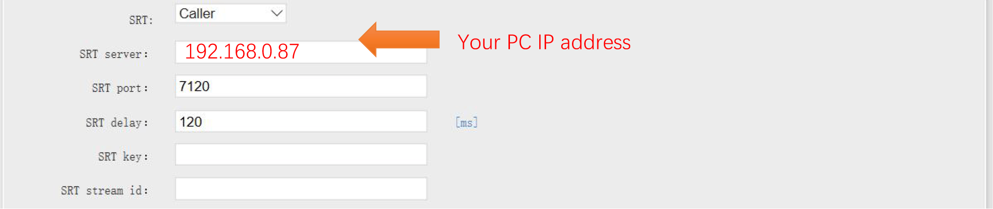 1.4 SRT choose “Caller” mode, input IP address of your computer in SRT server, SRT port and SRT Delay is default.