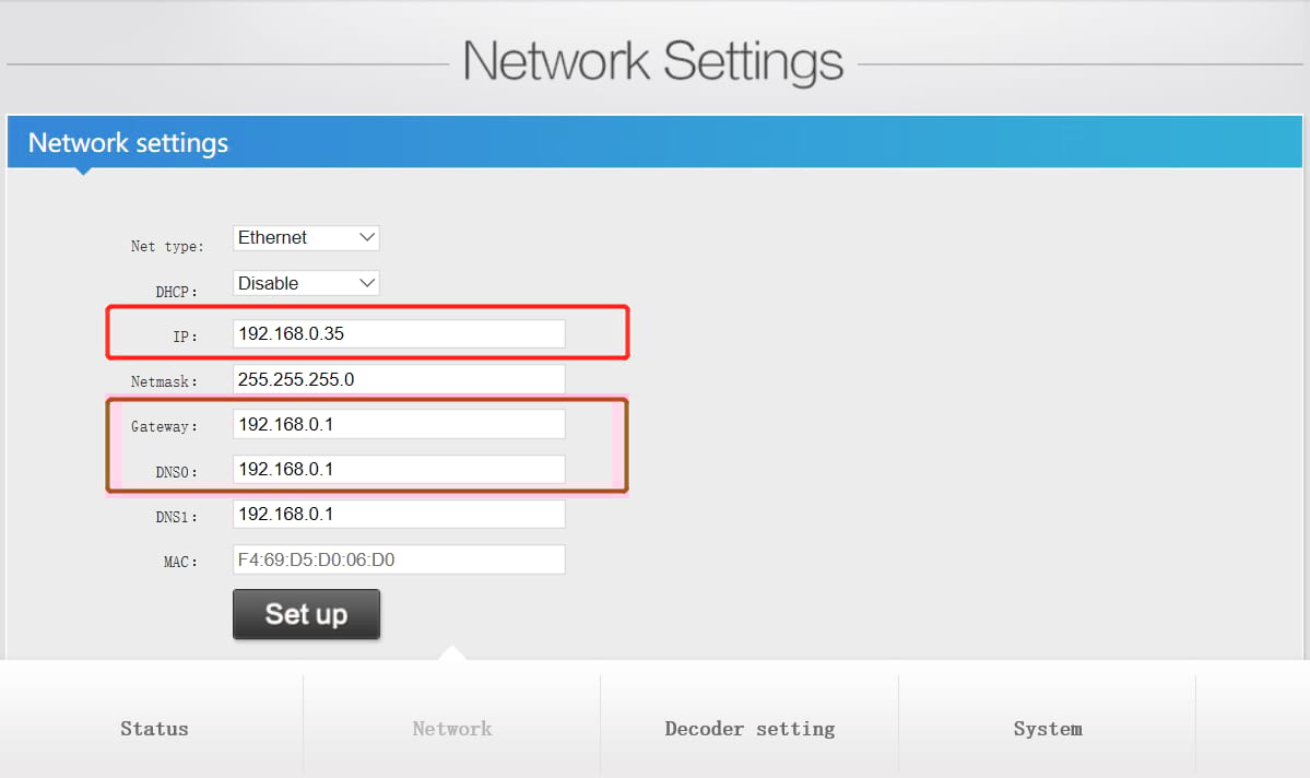 2.5Check that IP address of video decoder, keep it with your PC in the same network segment (including gateway and DNS).